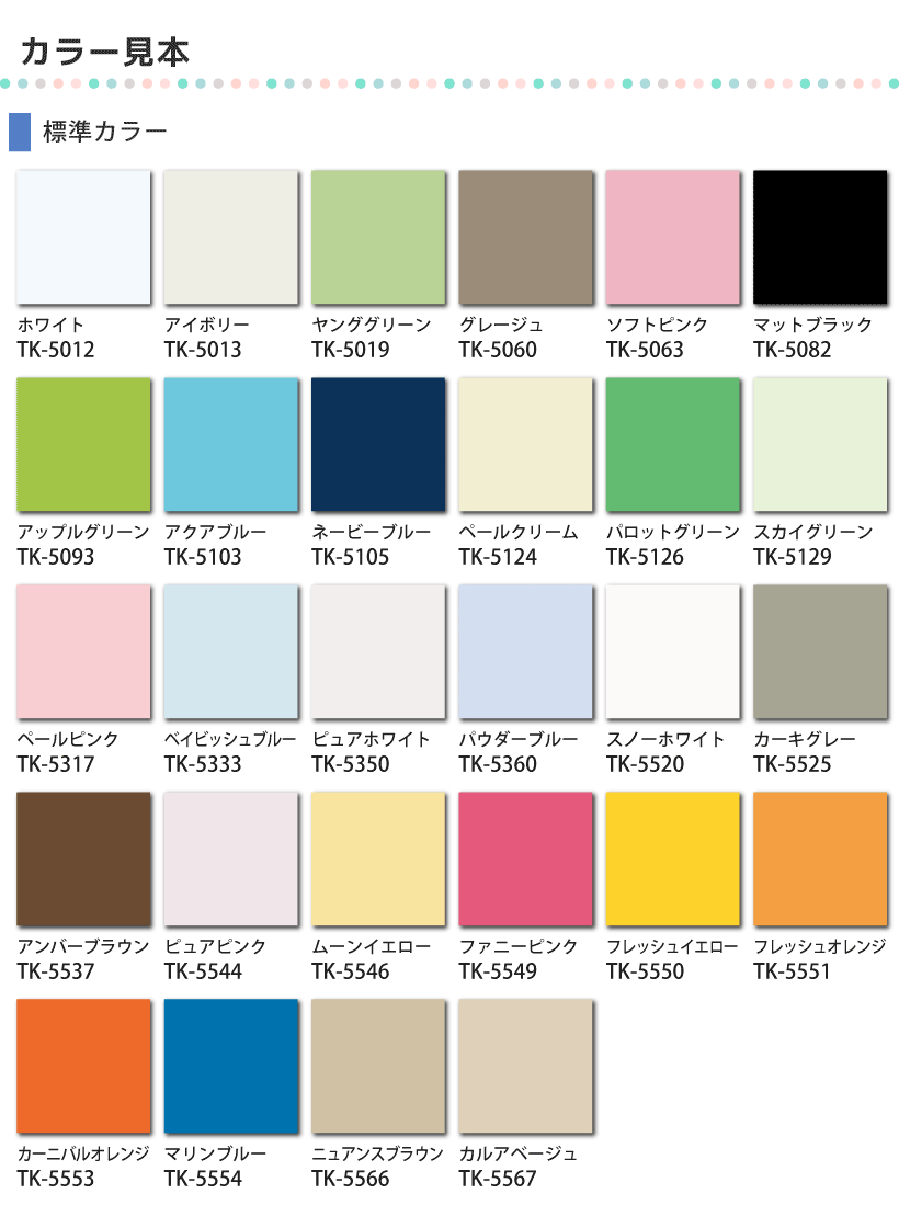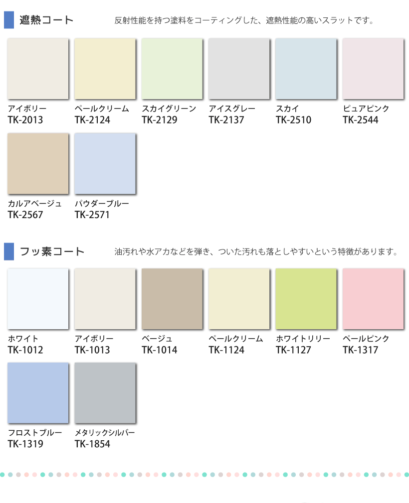 【仕様】 スラット幅 25mm 性 能 遮熱コート(TK-2013〜TK-2571)フッ素コート(TK-1012〜TK-1854) 特 徴 コストパフォーマンスに優れたスタンダードなブラインド。